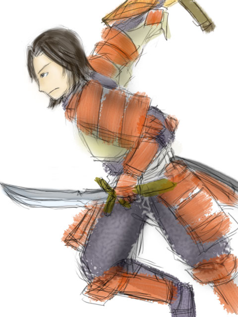 鬼武者3の左馬介です。 ふだんまったく使わないブラシ(?)で塗ってみました。 勢いよくかいたら、入りきらなかった・・。